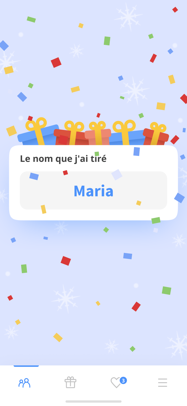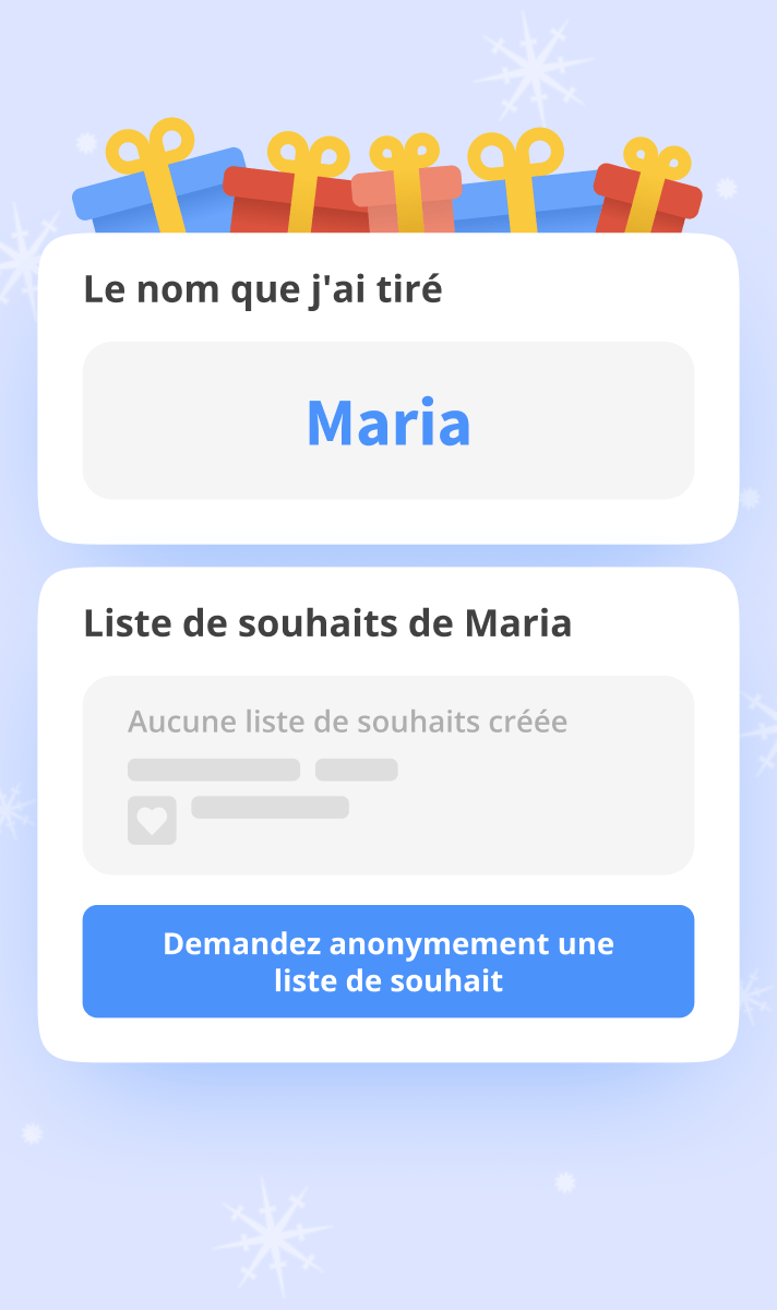 Chaque participant peut désormais tirer un nom au sort et créer une liste de souhaits. L'organisateur peut voir qui a tiré un nom, qui a fait une liste de souhaits et qui ne l'a pas encore fait.