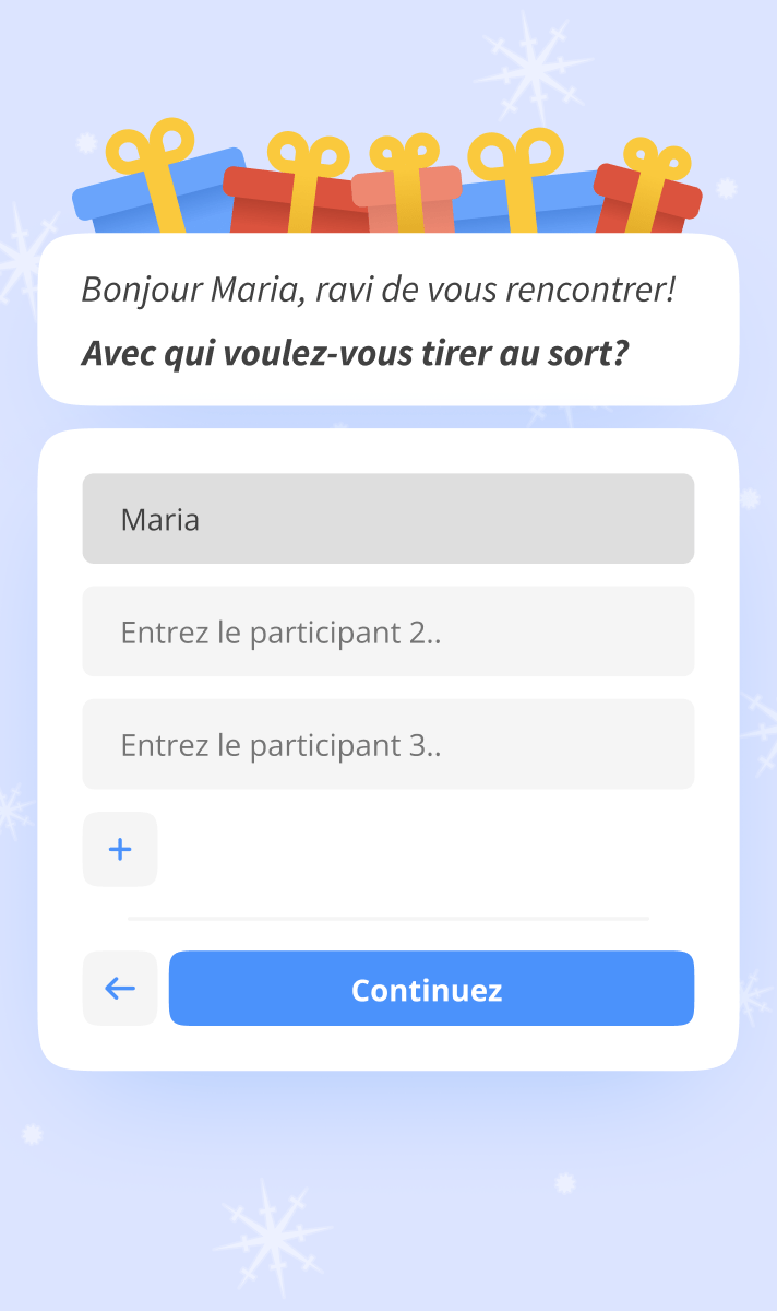 Tirez rapidement et facilement des noms au sort pour votre Secret Santa, Noël, Kwanzaa, Diwali, Hanoucca, Aïd el-Fitr ou Saint-Valentin.